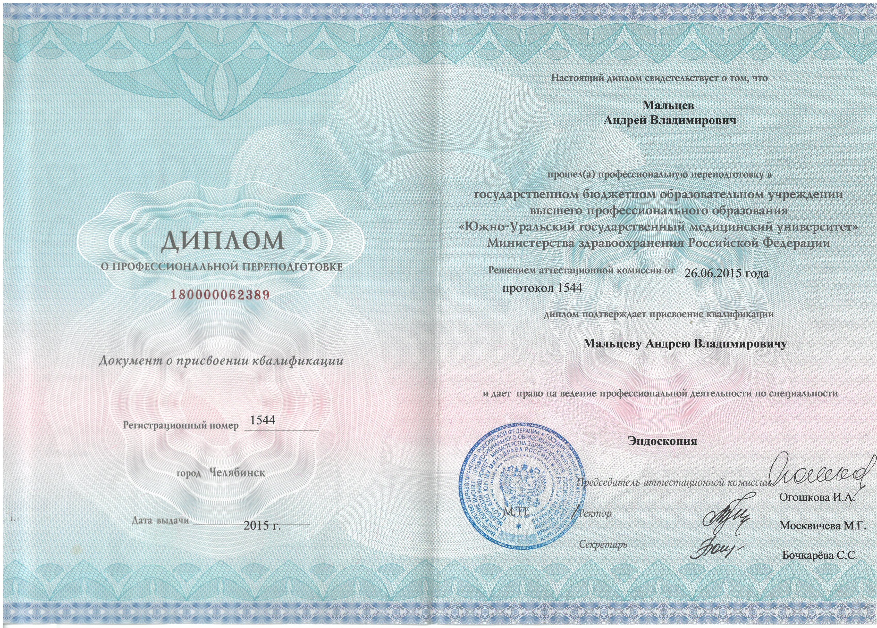 Диплом о профессиональной переподготовке №1544 от 26.06.2015 г