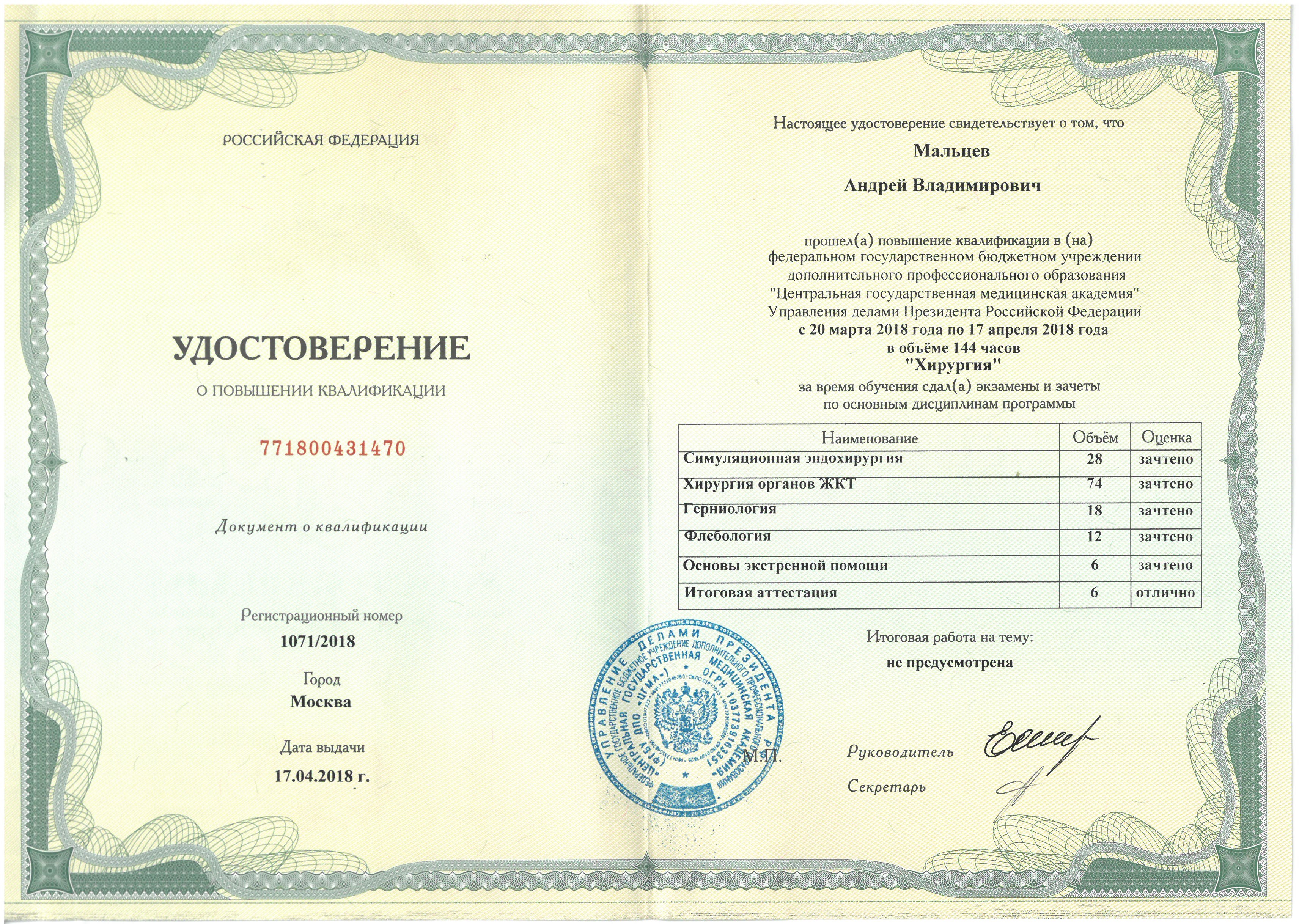 Удостоверение о повышении квалификации ЦГМА №1071/2018 от 17.04.2018 г